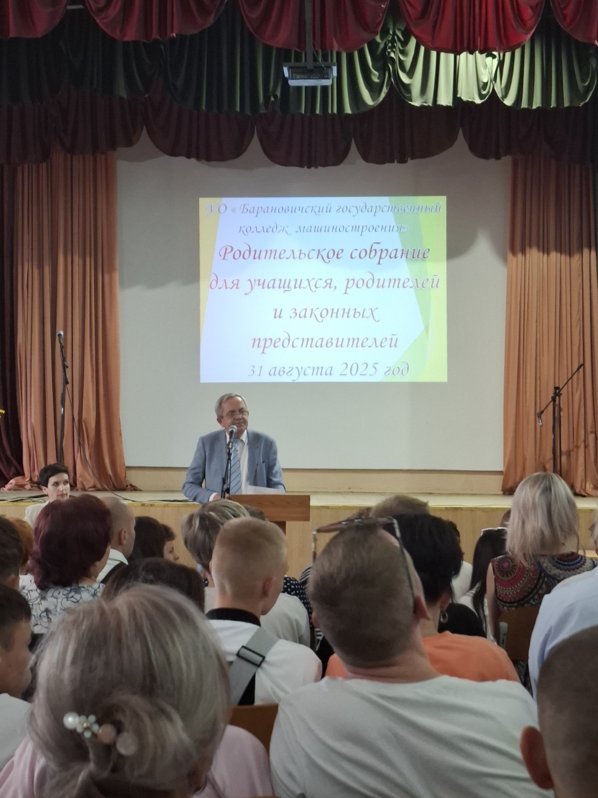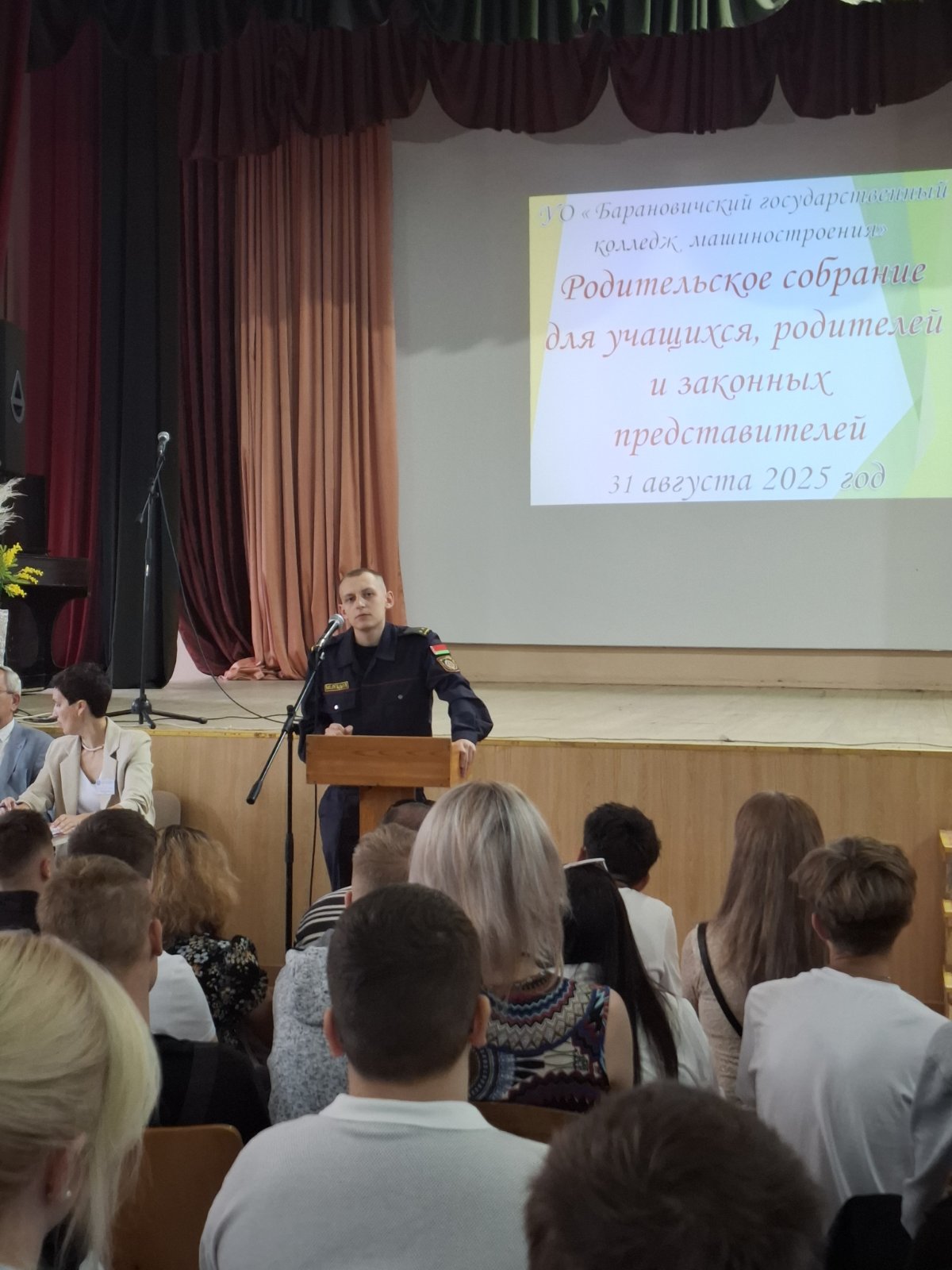 31 августа 2025 года в актовом зале колледжа прошло организационное собрание для учащихся 1 курса и их законных представителей. Руководитель колледжа Сибиров И.Г. поздравил присутствующих с зачислением и кратко ознакомил с материально-технической базой. Инспектор ИДН Барановичского ГОВД Ананко А.А. выступил с информацией по профилактике противоправного поведения.