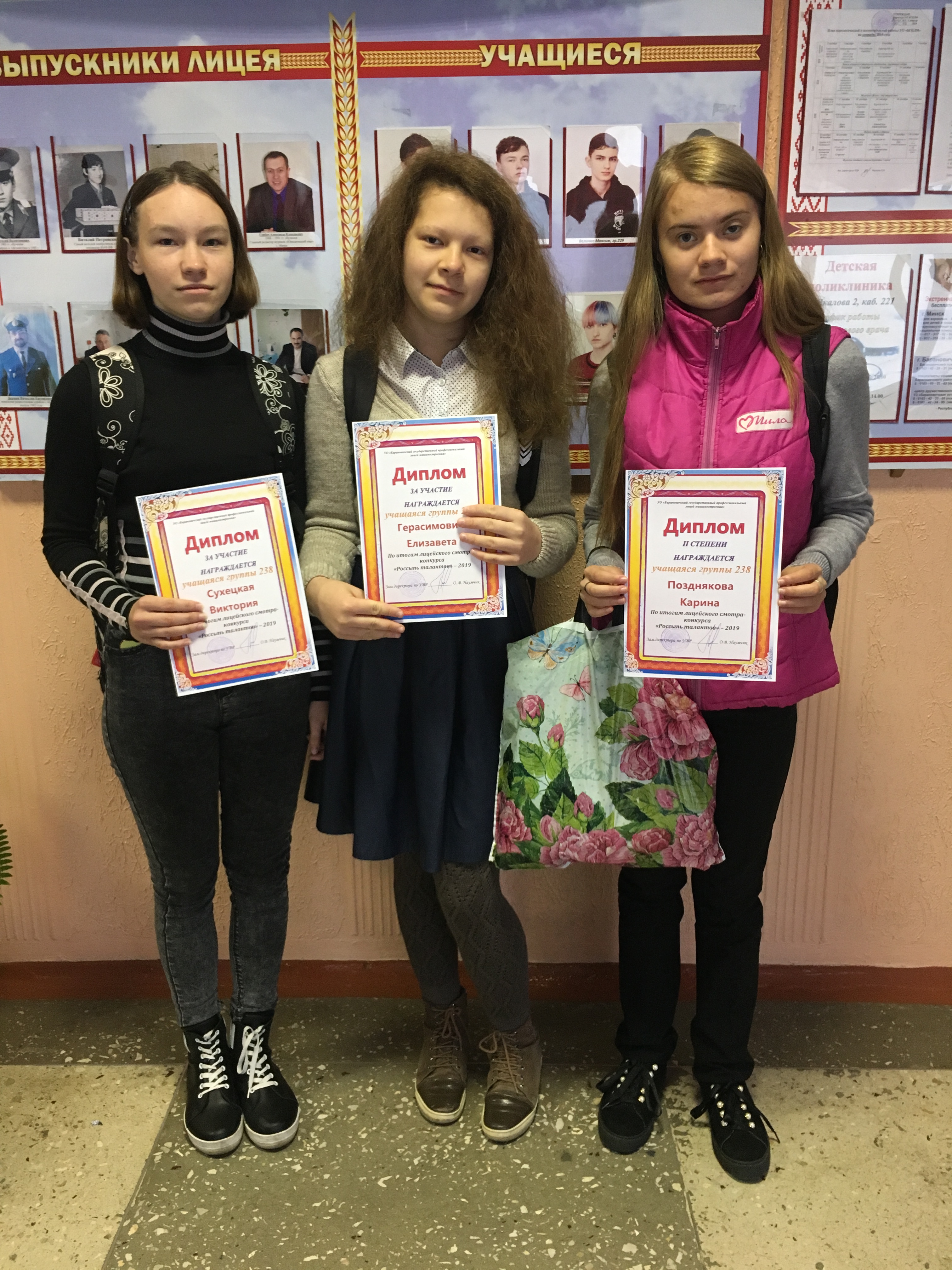 Дипломами I степени были награждены учащиеся гр.236 Масалевич Артем и Кытин Юрий. Дипломом II степени была награждена учащаяся гр.238 Позднякова Екатерина, дипломом III степени – Дрозд Полина учащаяся гр.236. Остальные участники также были награждены дипломами за участие.