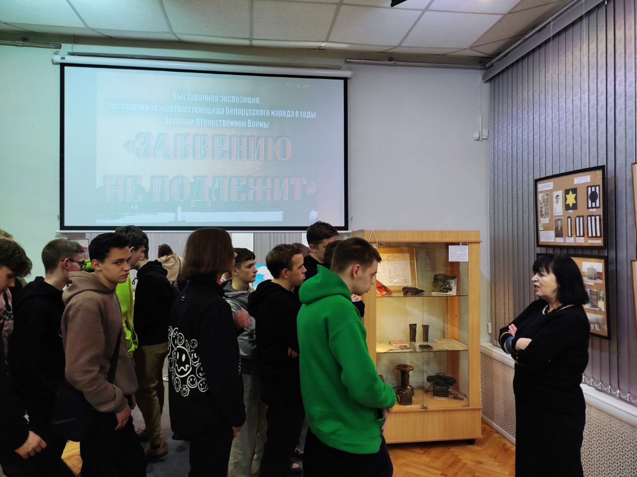 В целях гражданско-патриотического воспитания, выполнения плана мероприятий Года мира и созидания, учащиеся групп 1 и 2 курса посещают выставку "Забвению не подлежит", которая находится в выставочном зале Барановичского краеведческого музея.