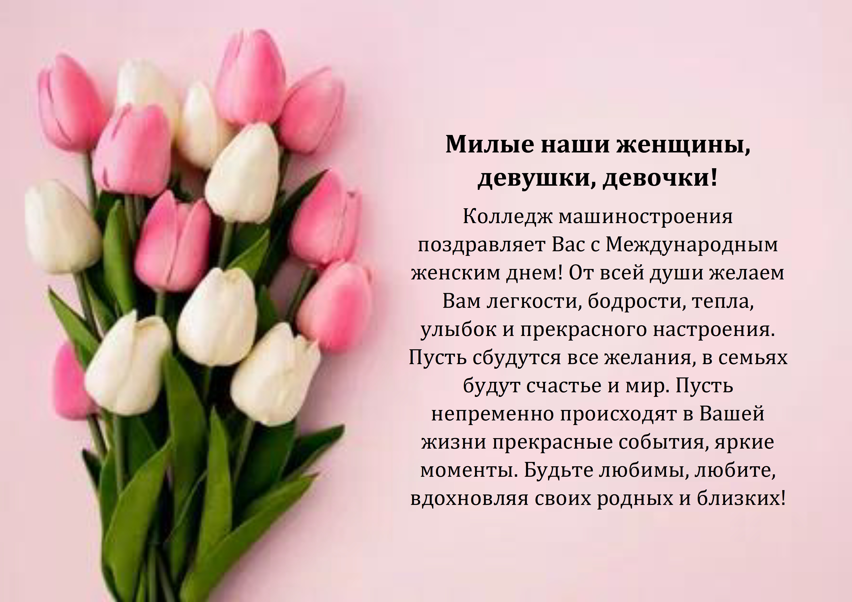 7 марта с тёплыми словами поздравления и пожелания долгой процветающей жизни, успехов в учёбе и работе, благополучия, счастья и просто хорошего настроения, учащиеся-волонтёры поздравили с наступающим Международным женским днём 8 Марта всех женщин и девушек нашего колледжа.