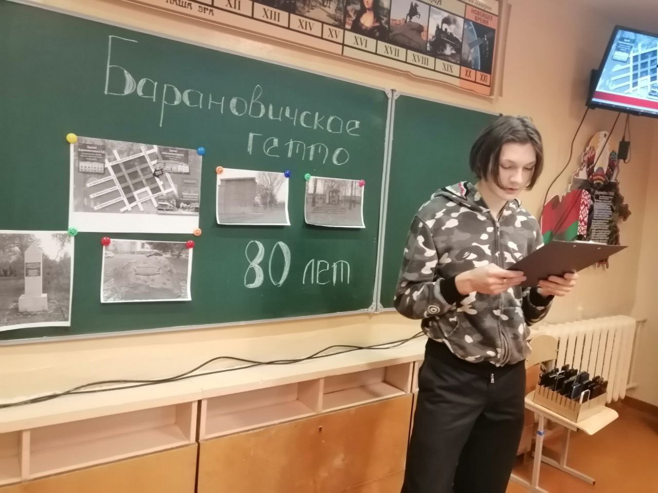 15 декабря в колледже машиностроения прошла акция, посвящённая памятной дате - 80-летию Барановичского гетто. С представителями от каждой группы, активистами среди своих однокурсников, был проведён информационный час, с целью распространения информации о геноциде на территории Баранович.