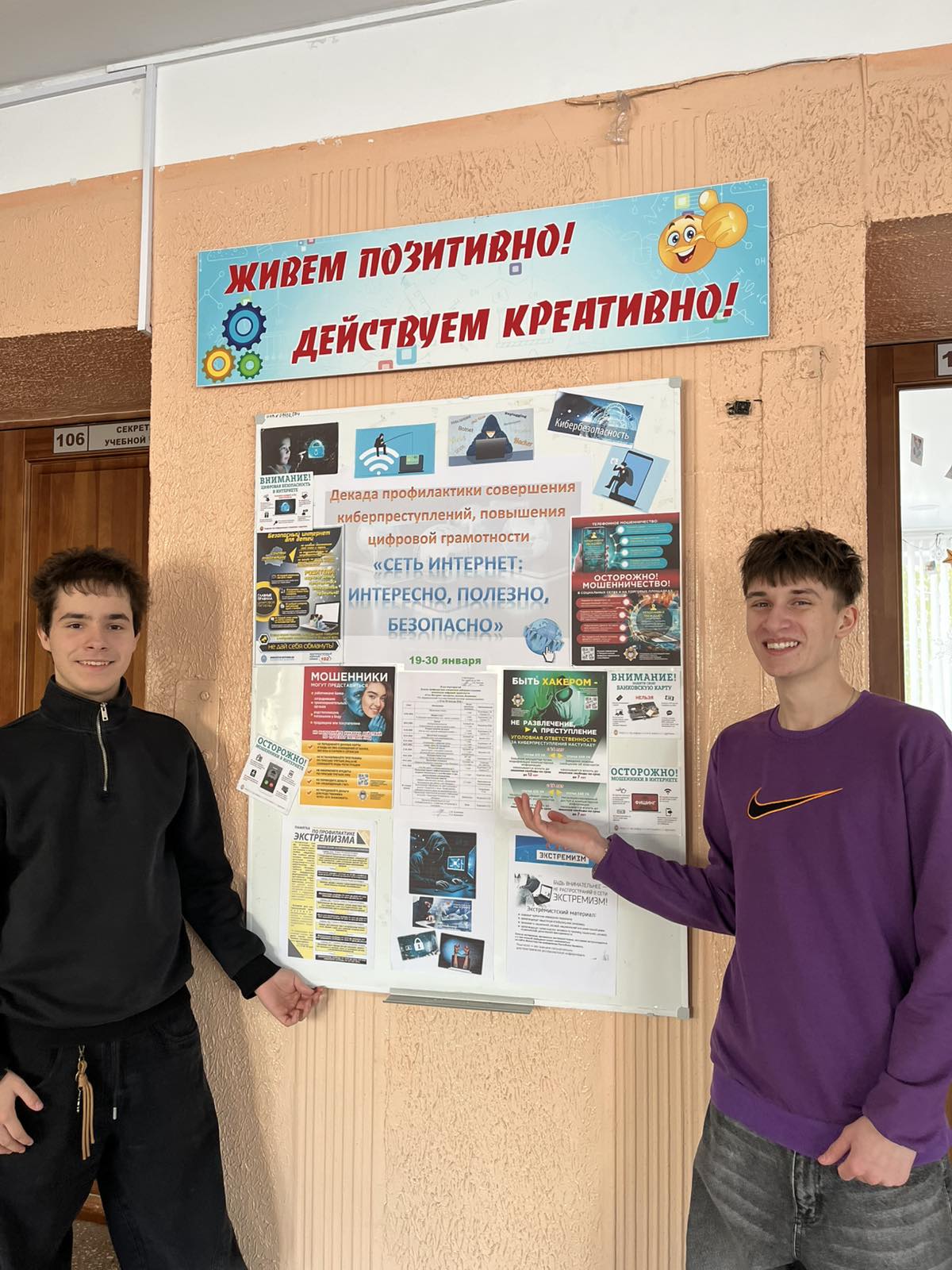 С 19.01.2026 по 30.01. 2026 года в колледже стартовала Декада профилактики совершения киберпреступлений, повышения цифровой грамотности "Сеть Интернет: интересно, полезно, безопасно". С целью формирования у учащихся знаний о проблемах кибербезопасности при работе в сети Интернет, обсуждения актуальных вопросов кибербезопасности, информированию об ответственности за совершение киберпреступлений, экстремистскую деятельность и выработки рекомендаций по защите данных и противодействию кибер угрозам и экстремизму педагогом организатором Борисович О.Л., куратором группы №271 Курочкиной С.В. и учащимися группы проведены следующие мероприятия: