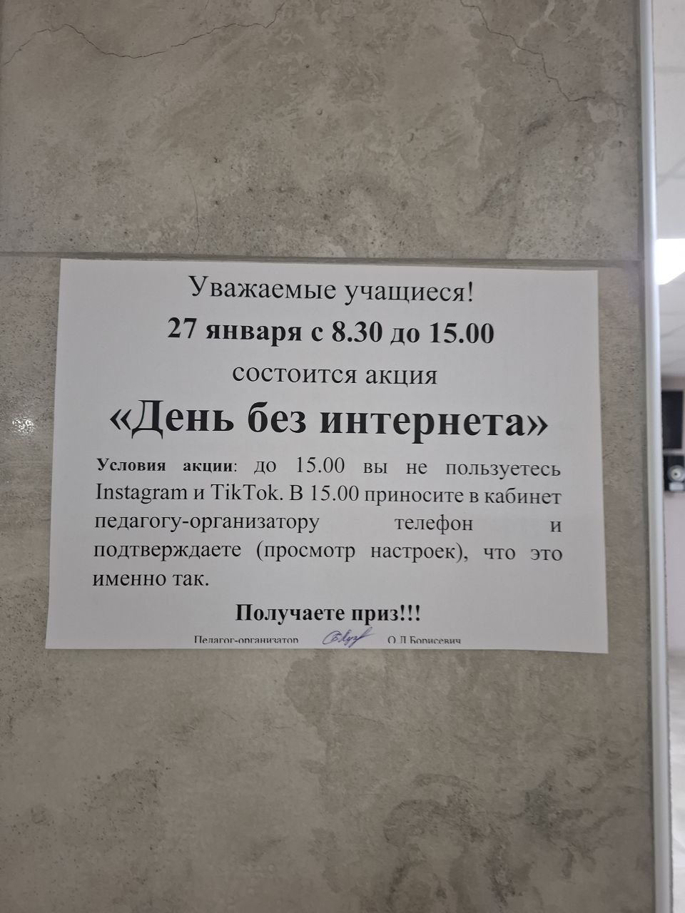 27.01.2026 г.- в нашем учреждении образования прошла акция " День без интернета" .Те ребята, кому удалось продержаться, получили призы. А таких оказалось 32 человека.